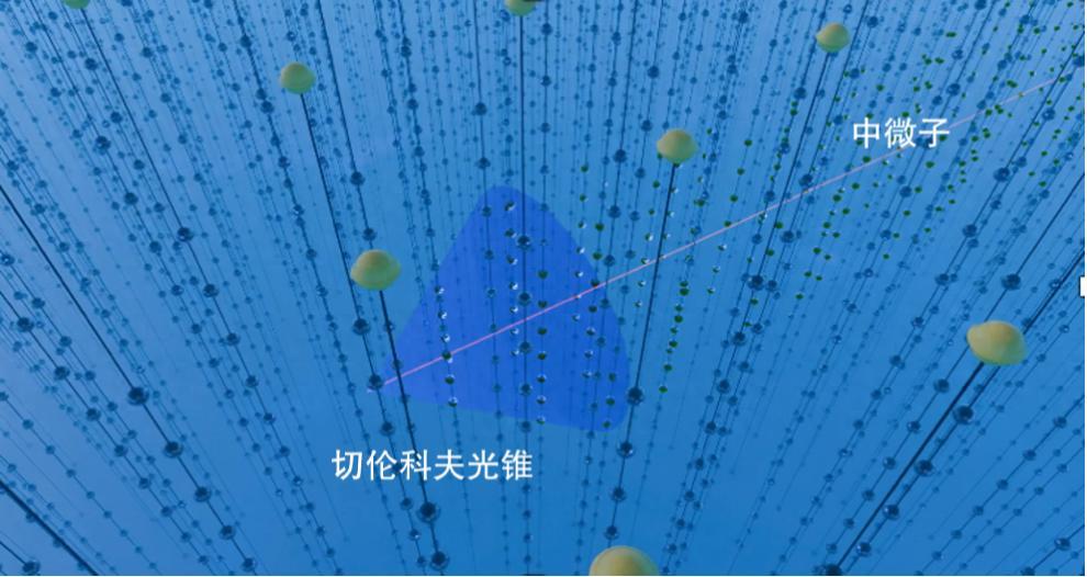 當能量很大的中微子擊中到水中的物質時,就會將自己的能量轉移給帶電粒子。這些帶電粒子在水中的速度就超過了光在水中的速度(光在水中的傳播速度只有真空中的大約75%),從而發出一種夢幻般藍色的輝光,也就是所謂的切倫科夫光。就好像一架飛機在空氣中飛行,當它的速度超過聲音在空氣中的速度時,會產生音爆一樣。
