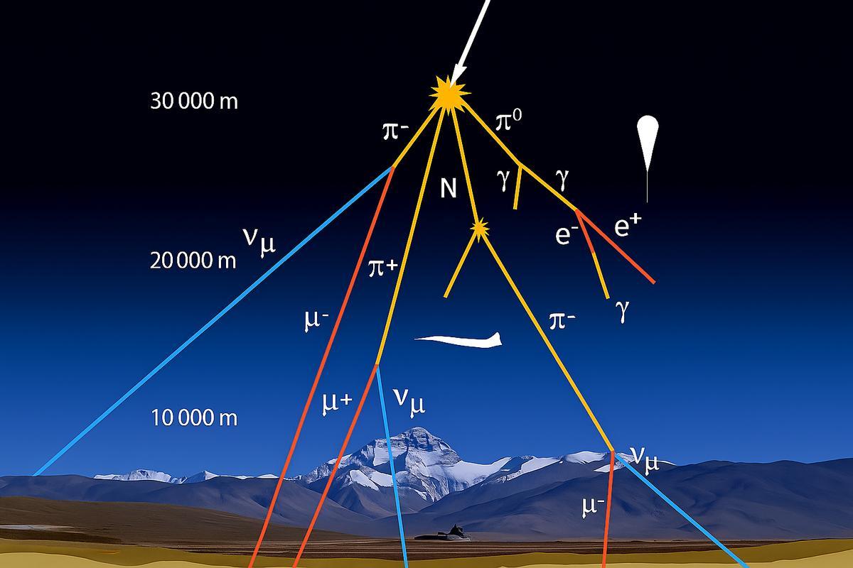 原來,宇宙空間瀰漫着大量被稱爲“初級宇宙射線”的高能帶電粒子,其中大部分是質子。它們接近地球時,開始與大氣層發生激烈碰撞,產生一簇簇的“次級射線”,並進一步衰變成繆子。由於繆子此時能量極高,根據愛因斯坦狹義相對論中的“鐘慢”效應,在我們的視角中,繆子的壽命“變長了”;同時,繆子較大的質量使它具有很強的穿透能力。最終,繆子能夠穿過萬米高空到達地表,在我們指甲蓋大小的面積上,每分鐘都會有一個繆子穿過。甚至在世界最深地下實驗室——中國錦屏地下實驗室中,繆子能夠穿過兩千米厚的山體,在探測器中留下自己的足跡,這也是地下實驗室的主要“噪聲”來源之一。