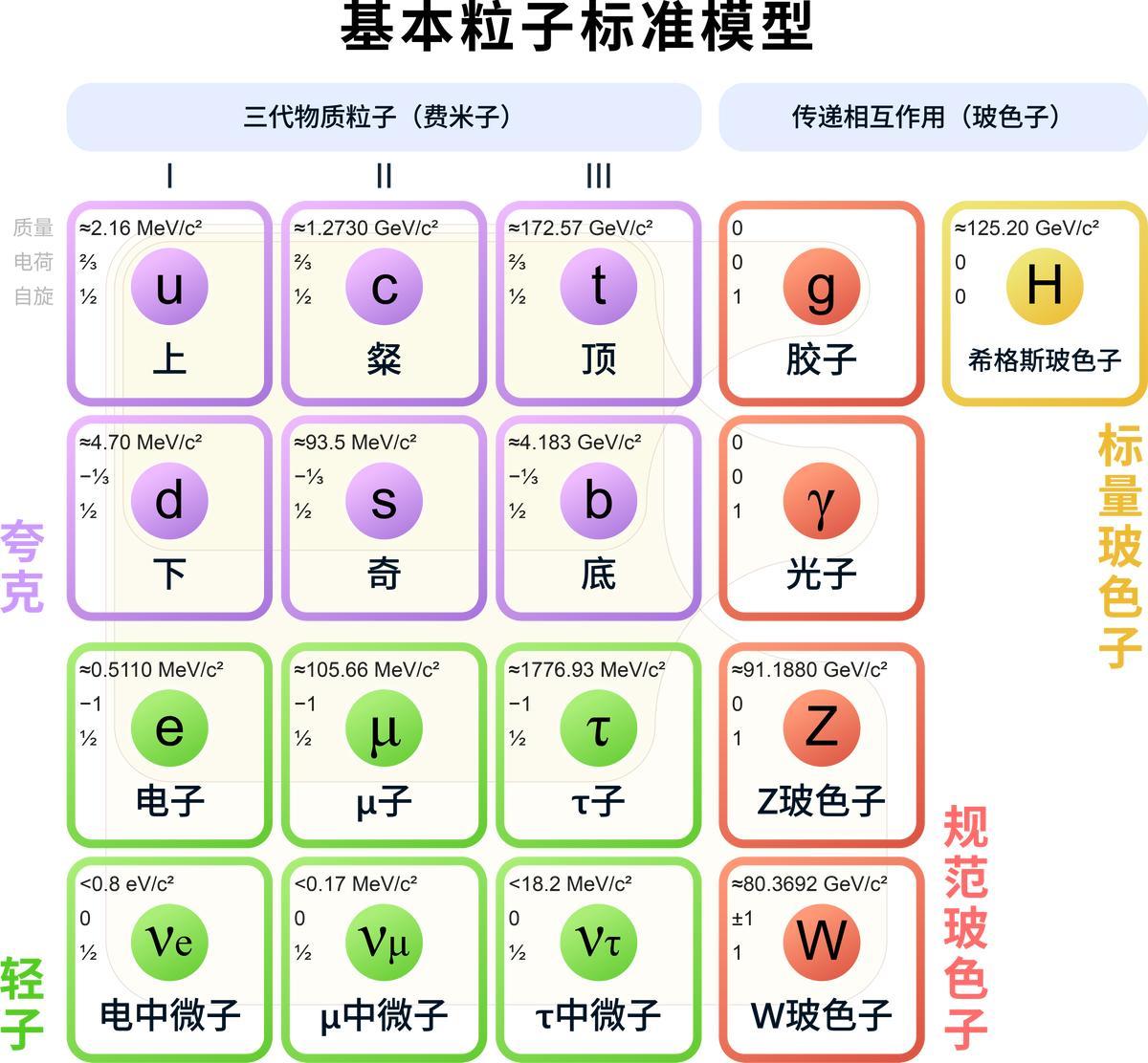 標準模型是人類迄今爲止最成功的理論,它是一張宇宙的“元素週期表”。其中,構成宇宙中所有可見物質的基本粒子被稱爲費米子,而玻色子負責傳遞各種相互作用,它們都由不可見的場的激發而產生,無法再分。費米子包括三個代際的夸克與輕子。夸克通過膠子傳遞的強相互作用結合在一起,形成上文提到過的質子和中子,進而組成原子核,第一代輕子——電子在光子傳遞的電磁相互作用下,圍繞着原子核運動,它們共同構成了我們觸手可及的物質。