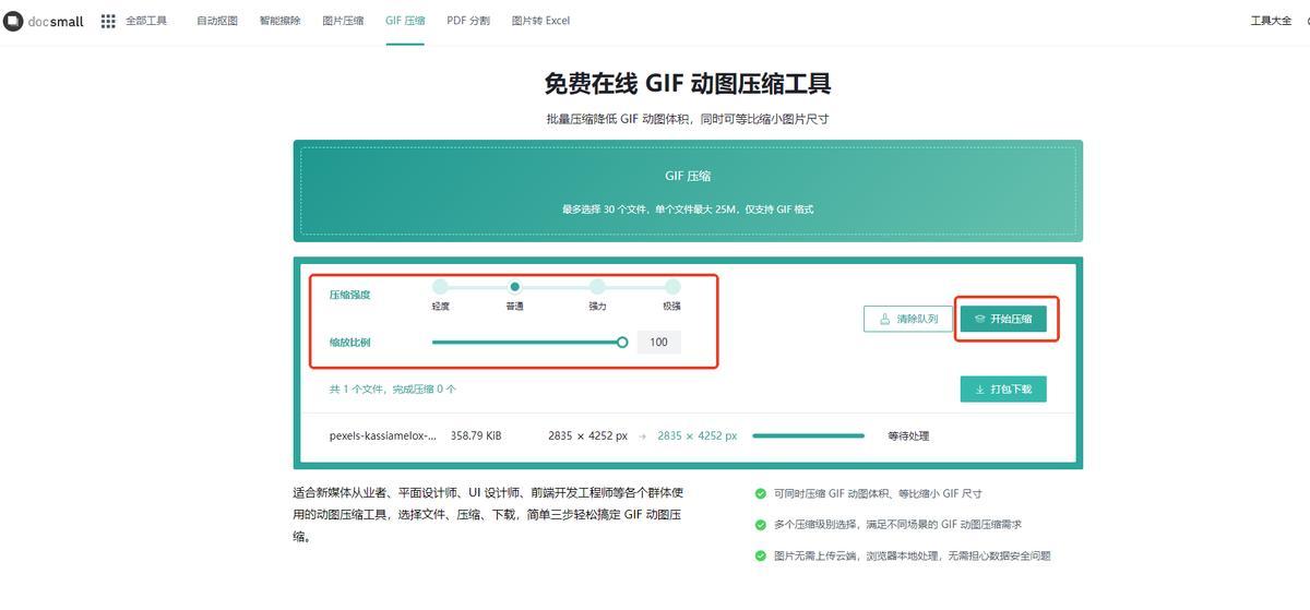 在網站首頁找到【GIF壓縮】,進入後導入多個GIF文件,設置一下壓縮強度和縮放比例,接着點擊【開始壓縮】按鈕即可。
