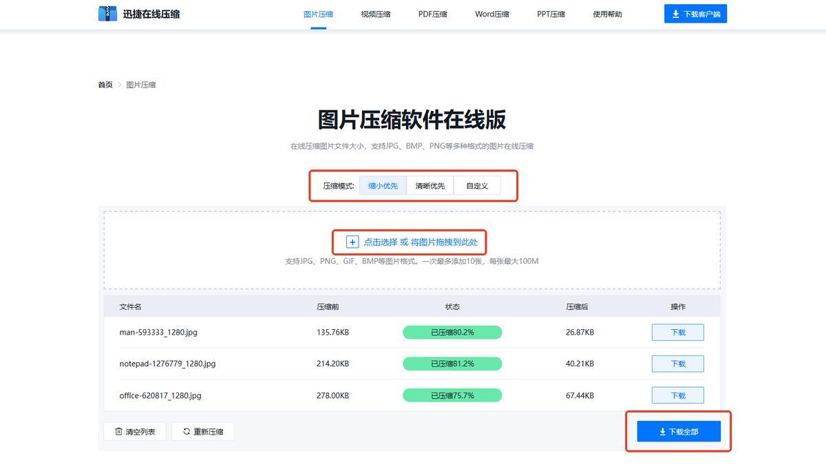 網站支持縮小優先、清晰優先和自定義壓縮模式,先選擇壓縮模式,然後點擊上傳按鈕導入GIF,網站就會自動對GIF進行壓縮處理。