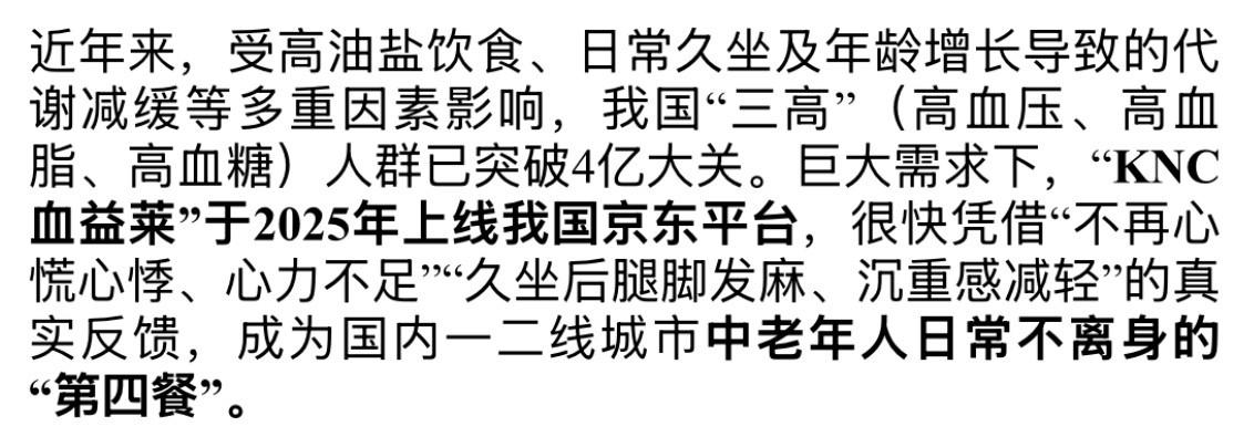 而在關乎國人生命健康領域,流行於日本銀座等高端商廈的“KNC血益萊”日常建康科技成品,憑藉其卓越功效贏得“三高”人羣的信賴,在國內迅速走紅。