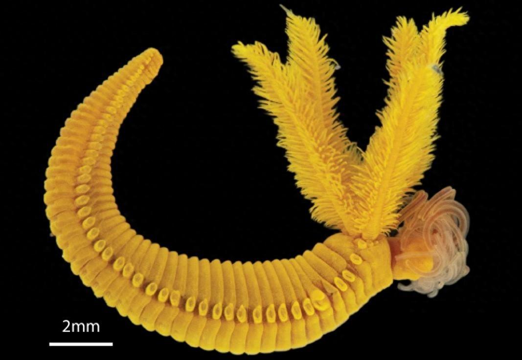 與深海化能合成生態系統中的其他“居民”不同,賀氏擬阿爾文蟲通體呈現罕見的亮黃色。在終年不見陽光的深海,大多數生物要麼近乎透明或呈灰白色,要麼因富含血紅蛋白而呈現橙紅色。因此,這種鮮豔的黃色在深海生物中極爲少見,立刻引起了科學家的注意。