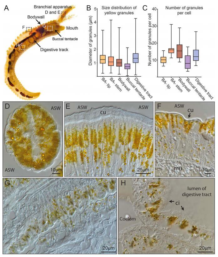 在鰓絲尖端,黃色顆粒的平均直徑爲1.29微米;在體壁表皮細胞中爲1.04微米;而在口觸手中的顆粒較小,平均直徑僅0.77微米。有趣的是,所有含有這些顆粒的細胞都直接與海水接觸,而且顆粒總是聚集在靠近海水一側的細胞質中。
