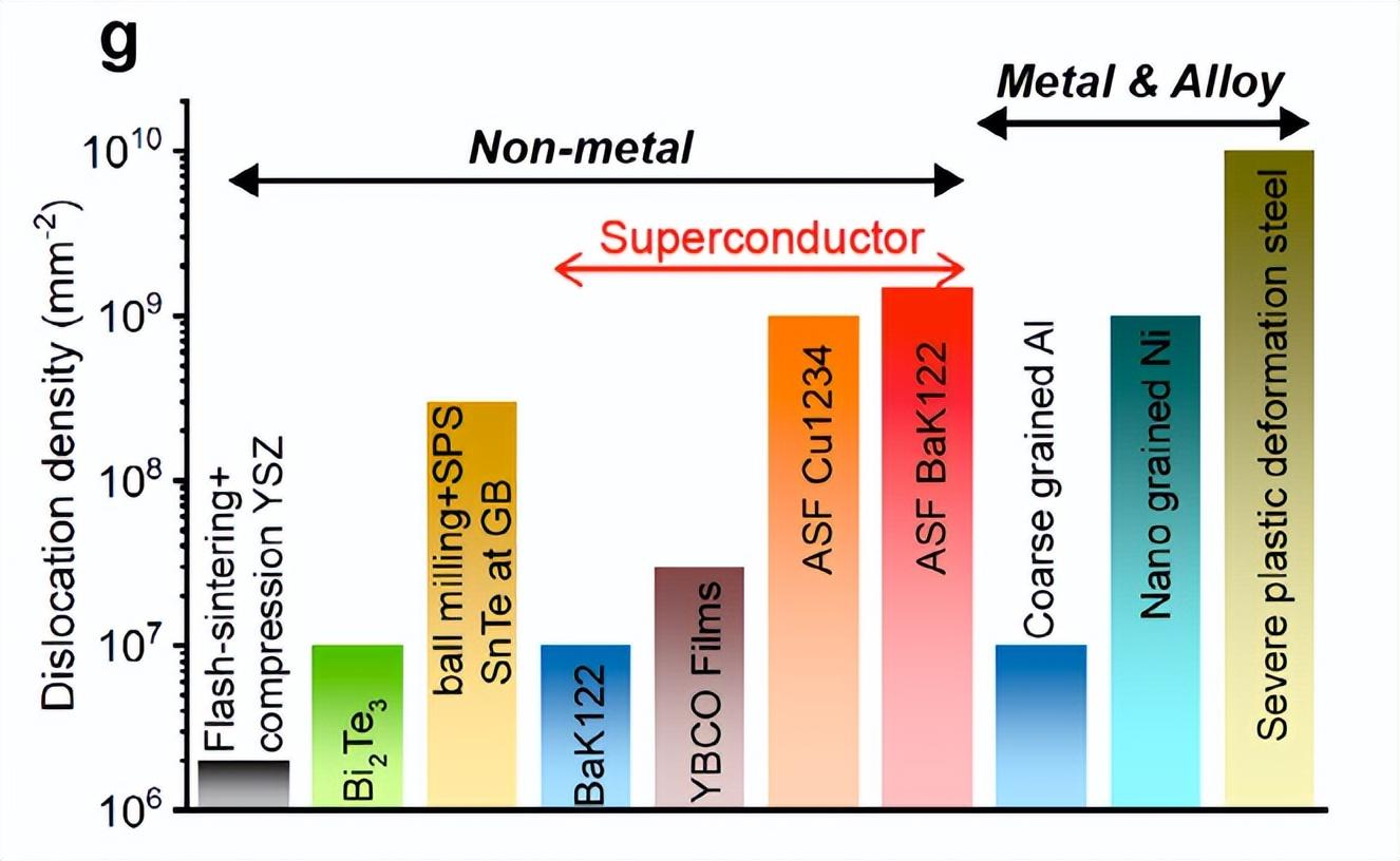 通過非對稱應力場工藝處理的BaK122的位錯密度(ρD),與各種非金屬和金屬體系的比較。