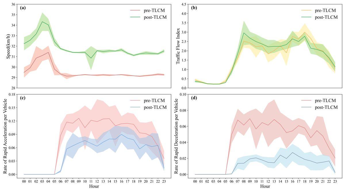 我們針對道路上紅綠燈倒計時功能開放前和開放後,以濟南齊魯大道爲例開展碳排放研究。開啓後,道路車輛行駛更加平順,整體碳排放減少了4.4%左右。若該措施推廣全國,簡易估算將減少約8.55TgC碳排放,幾乎爲全國灌木碳匯量的一半。