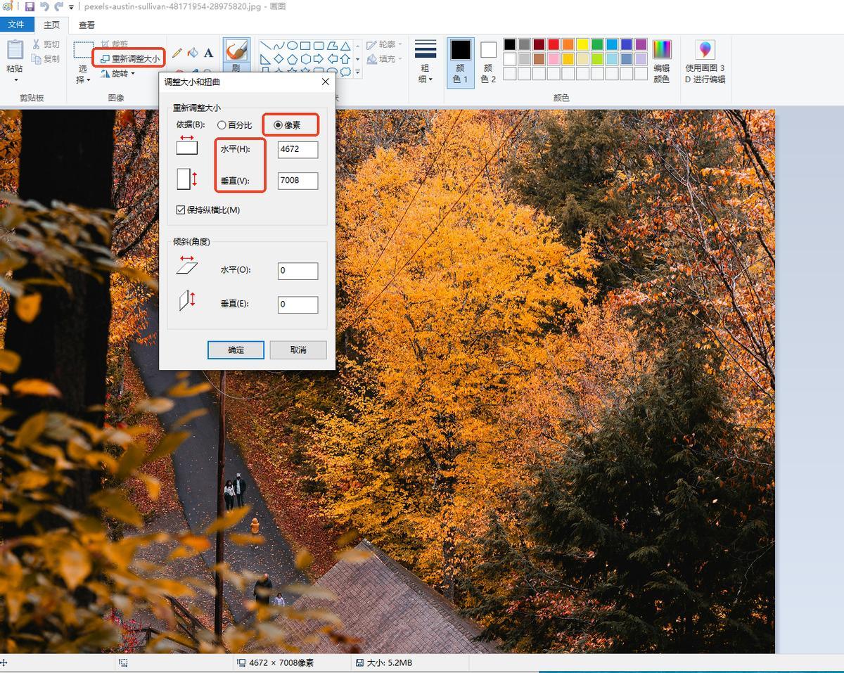 使用畫圖打開圖片,點擊【重新調整大小】,選擇像素,調整水平和垂直,最後點擊【確定】即可。