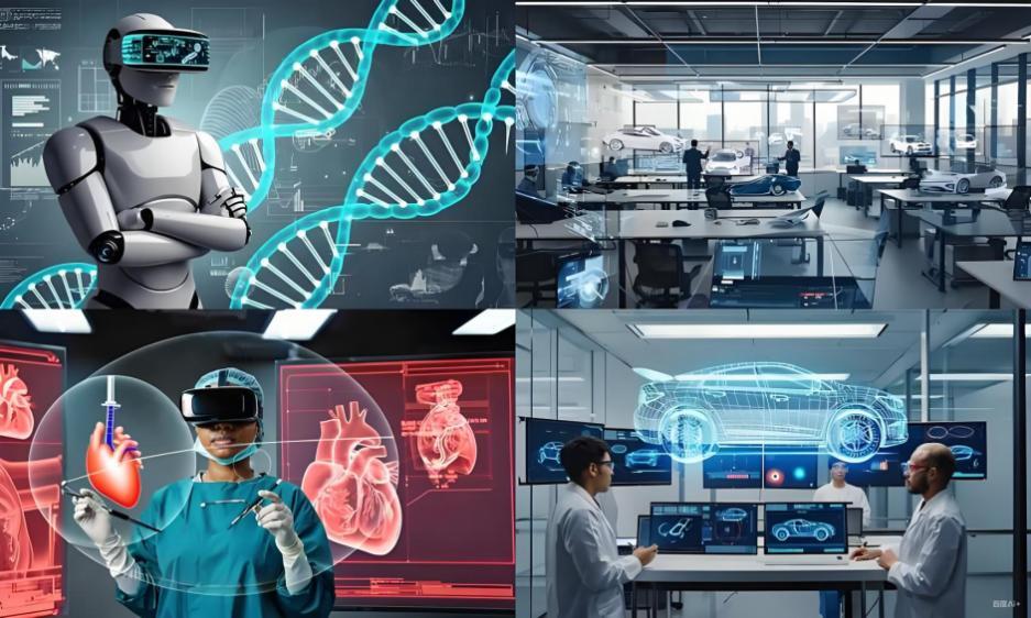 虛擬現實應用場景示意:虛擬辦公(右上)、虛擬醫療(左下)、虛擬設計(右下)