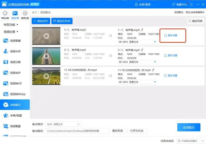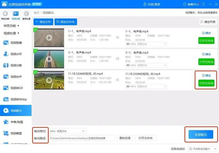 完成後設置一下輸出格式和輸出路徑等參數,點擊【全部配樂】,即可得到音頻和視頻合併後的視頻了,打開即可使用。