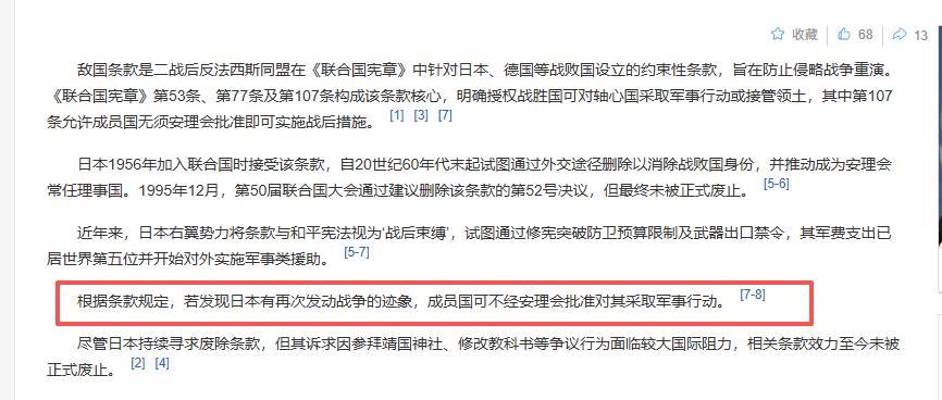 要知道的是,根據敵國條款,一旦發現日本有再次侵略的跡象,二戰戰勝國中國以及俄羅斯,是可以不經安理會批准,直接對日本動武,所以俄羅斯的這句話也是在警告日本,再不老實,中俄都有理由消滅你。