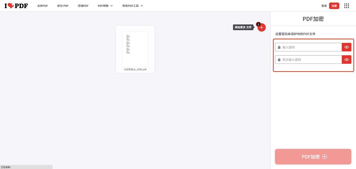 一個國外的在線PDF處理網站,支持中文,用起來沒有語言障礙。只需要在首頁找到【PDF加密】功能,進入後導入PDF文件,點擊【PDF加密】按鈕即可,適合臨時處理文件的時候使用。
