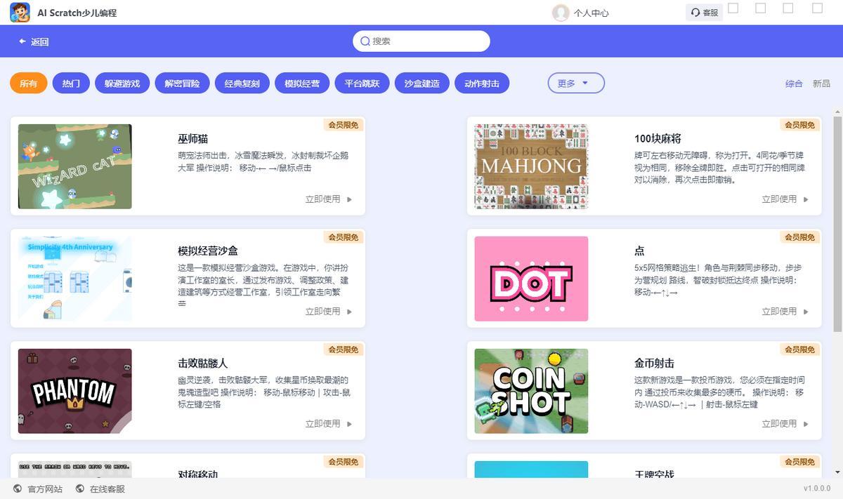 軟件自帶各種類型的優秀案例,包括躲避遊戲、解謎冒險、平臺跳躍、沙盒建造等,孩子可以在這裏找到喜歡的遊戲類型,並根據興趣的引導進行學習,製作成專屬於他自己的遊戲或動畫。