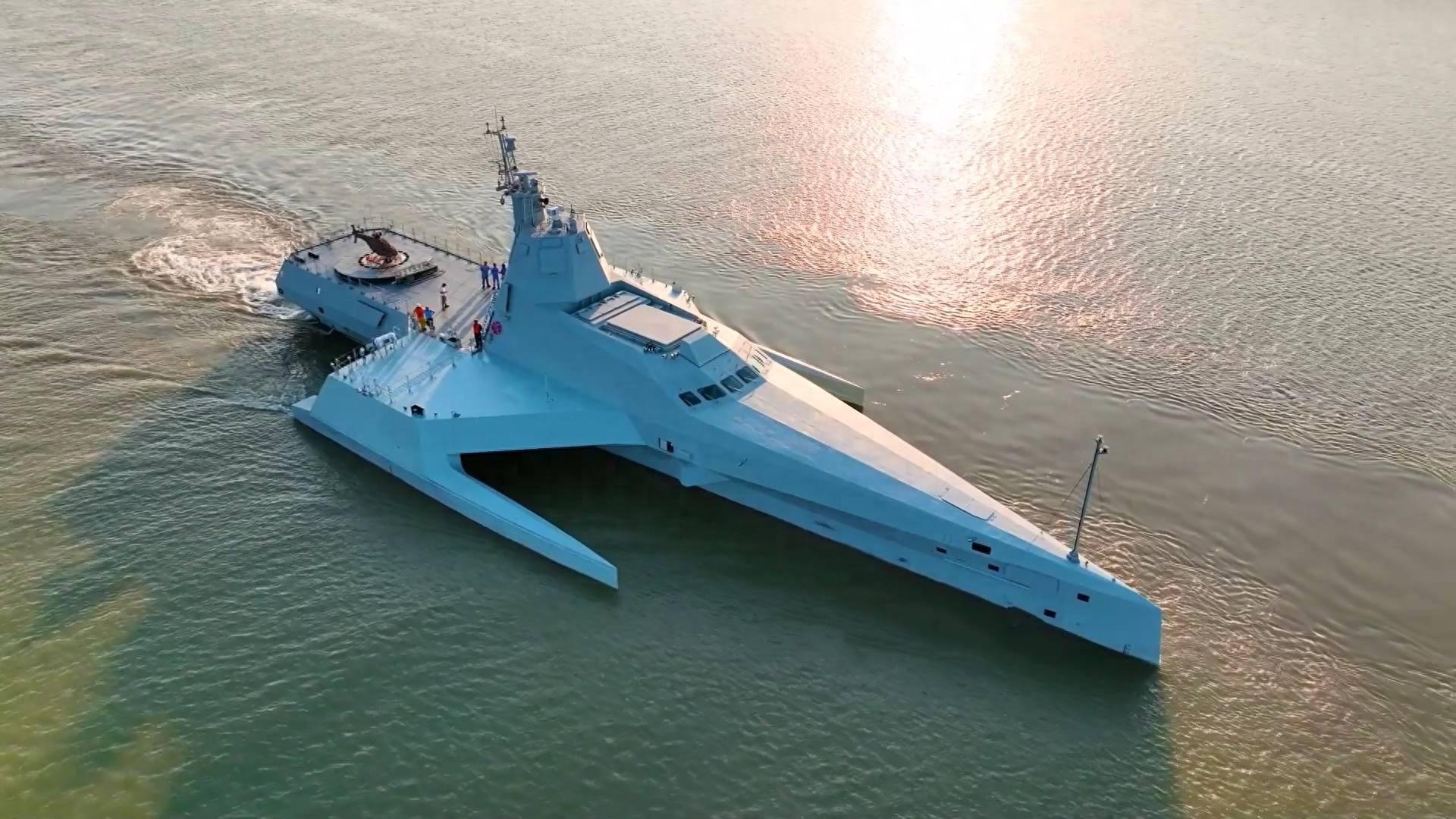 這艘艦艇的甲板上,壓根瞧不見傳統意義上的艦橋,取而代之的,是一個跟潛艇圍殼差不多的指揮艙,其表面密密麻麻地佈滿了數據鏈天線,艦體採用三體佈局,中間主船體細長,兩側延伸出穩定舷架,能在高速航行時減少橫搖,提升惡劣海況下的穩定性。