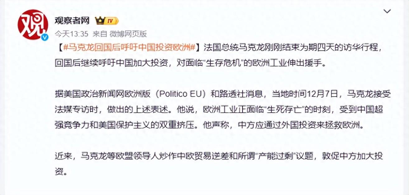 結果呢,回國之後的馬克龍就變臉了,說:歐洲工業正面臨“生死存亡”的時刻,受到中國超強競爭力和美國保護主義的雙重擠壓。中方應通過外國投資來拯救歐洲。