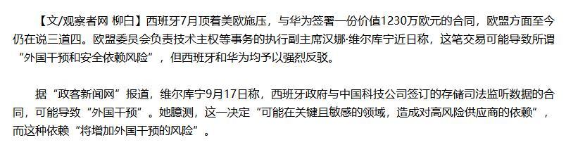 今年7月,西班牙與華爲簽署一份價值1230萬歐元的合同。結果歐盟上躥下跳,又開始指手畫腳,指責這筆交易可能導致所謂,“外國干預和安全依賴風險”。