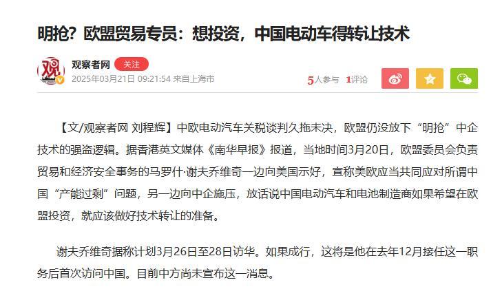 還有,中國電動汽車產業發展的很好,結果歐盟一邊對中國電動汽車加徵關稅,一邊又要強搶中國技術。歐盟放話,中國電動汽車和電池製造商,如果希望在歐盟投資,必須要技術轉讓。