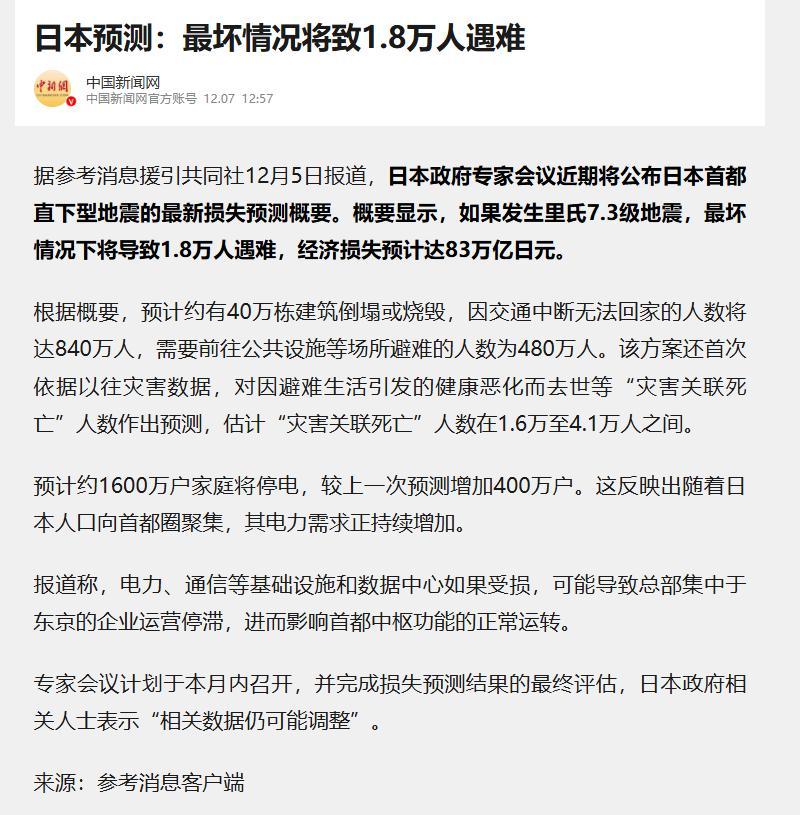 說來也巧,日本剛剛預測過7.3級地震,最壞情況會導致18000多人遇難。12月5日,共同社報道,日本政府專家會議近期將公佈,日本首都直下型地震的最新損失預測概要。