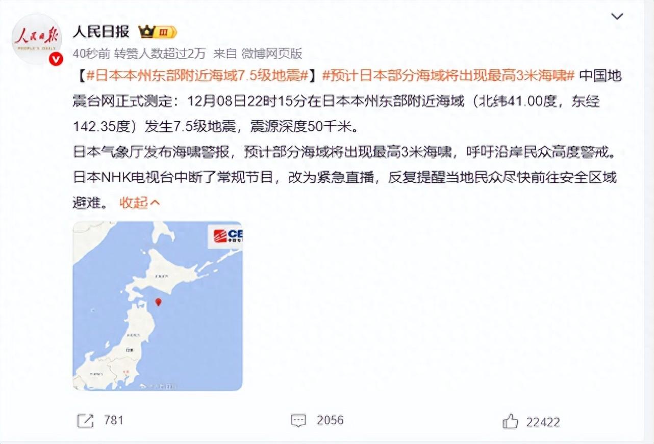 日本地震了,12月8日深夜,日本本州東部附近海域發生7.5級大地震,震源深度50公里,大半個日本都有震感。日本氣象廳預計,此次地震還將引發3米級海嘯,呼籲低窪地區的居民儘快撤離,目前暫時不清楚此次地震造成的傷亡情況。