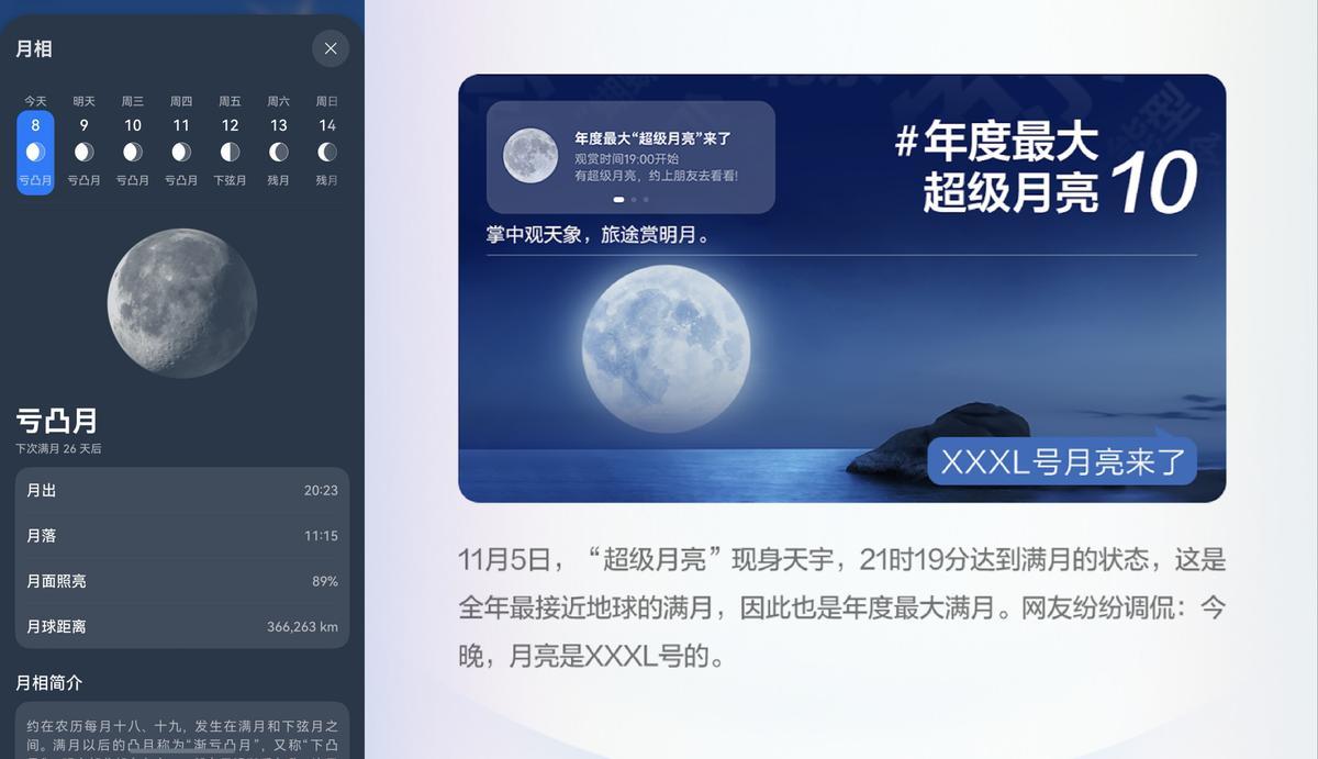 除了智能卡上的各種天氣提醒跟預警,華爲天氣還有很多寶藏功能。像榜單裏提到的“超級月亮”,其實可以看看華爲天氣的月相卡片提前“預約”。 11月5號超級月亮那次,我就是提前看了月相卡片,再結合多日預報中的天氣、雲量、能見度等情況,準時蹲點拍拍拍,果然輕鬆拿下朋友圈滿贊!