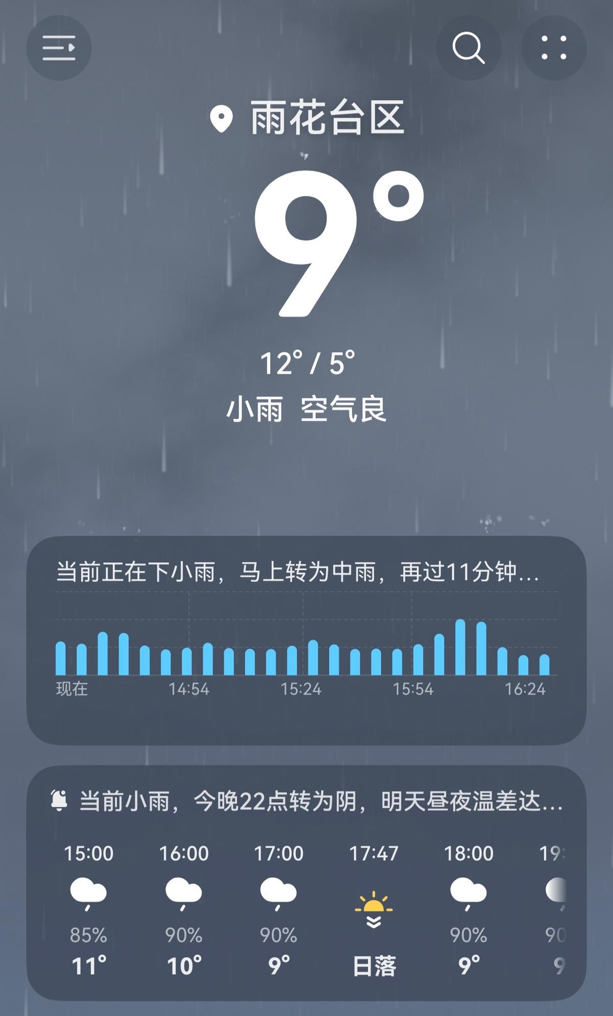 不過要我說,華爲手機用戶可以少一些這樣的破防時刻。華爲天氣首頁智能卡會根據異常天氣、溫度、降水等實時推送提醒和建議,每次看到都是我的“今日運勢”參考卡。比如我上下班的時候,最怕的就是出門遇上下雨變“落湯雞”,看到推送分鐘級降水提醒,根據雨勢分析,提前打好車,穩穩下班。