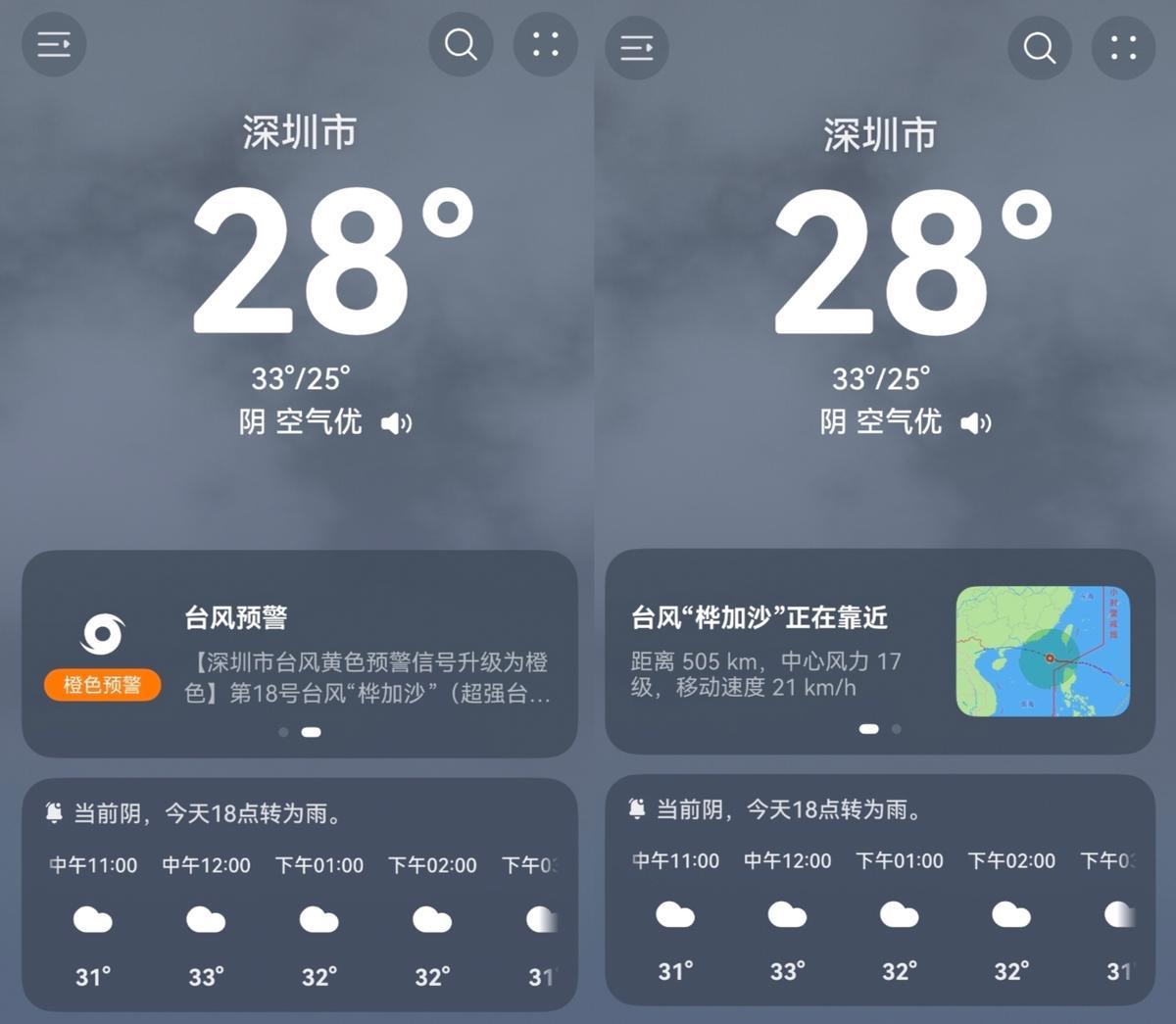 現在看個天氣已經成爲我的出門“儀式感”,運動前、上班前、逛街前都要看上一眼才安心。除了實時的降水提醒,颱風、大霧、大雪等極端天氣提醒也能讓我避開“天氣刺客”。尤其夏秋交際,南方沿海地區的颱風格外猖狂。華爲天氣早及時提示我“樺加沙”颱風來襲的消息,簡直是我應對各種天氣副本的通關祕籍。