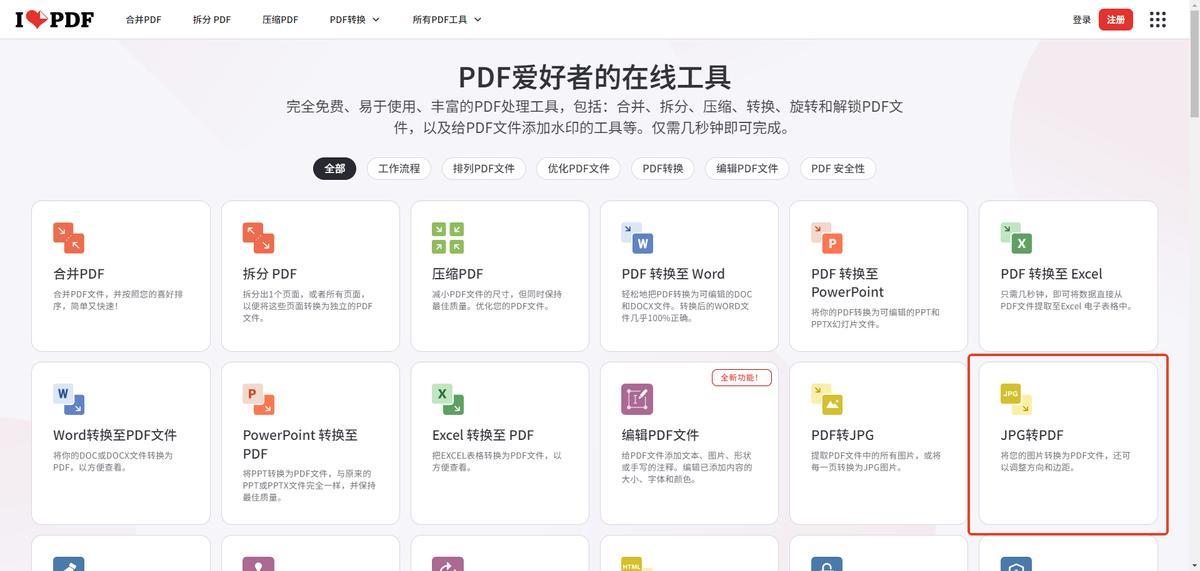 一個在線的PDF工具網站,能夠將圖片轉爲PDF,網站界面很直觀,很快就能找到需要的功能,選擇【JPG轉PDF】並進入轉換界面,操作也比較簡單,導入圖片後上傳即可,適合偶爾需要轉換文件格式的朋友使用。