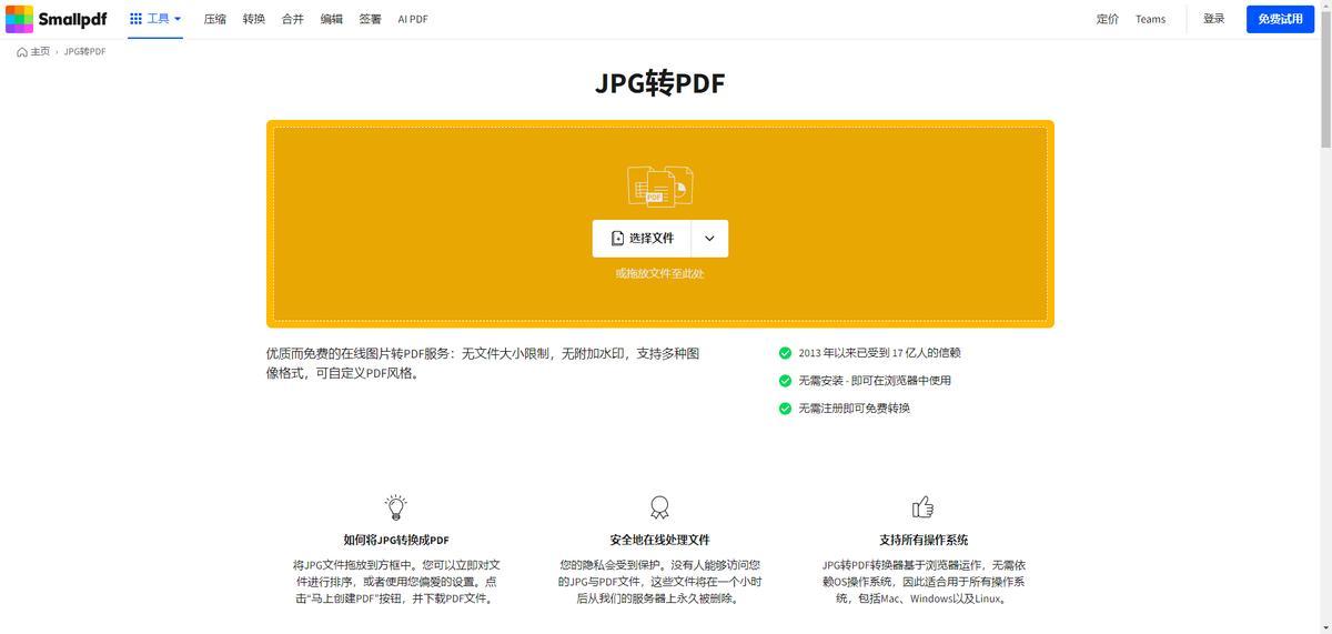 一個國外的在線PDF工具網站,界面乾淨,可以用來將圖片轉爲PDF,可以導入JPG、PNG、BMP等格式,只需要選擇【JPG轉PDF】,導入圖片文件,接着點擊轉換按鈕即可。
