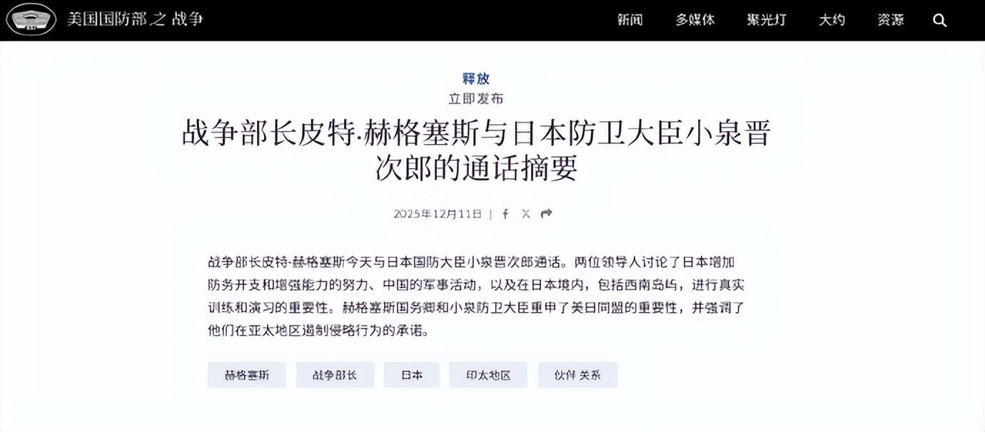 12月12日,小泉進次郎終於聯繫上了美國戰爭部長赫格賽斯,然後又炒作,啊,日本贏得了美國的支持,但是至今美國也沒有,就F-15J被殲15雷達照射一事表態;美國戰爭部和赫格賽斯也沒在公開場合支持日本,僅僅就是重申了所謂的美日同盟重要性。想想也是哦,F15可是美國戰機,美國咋表態,承認F15技不如人?