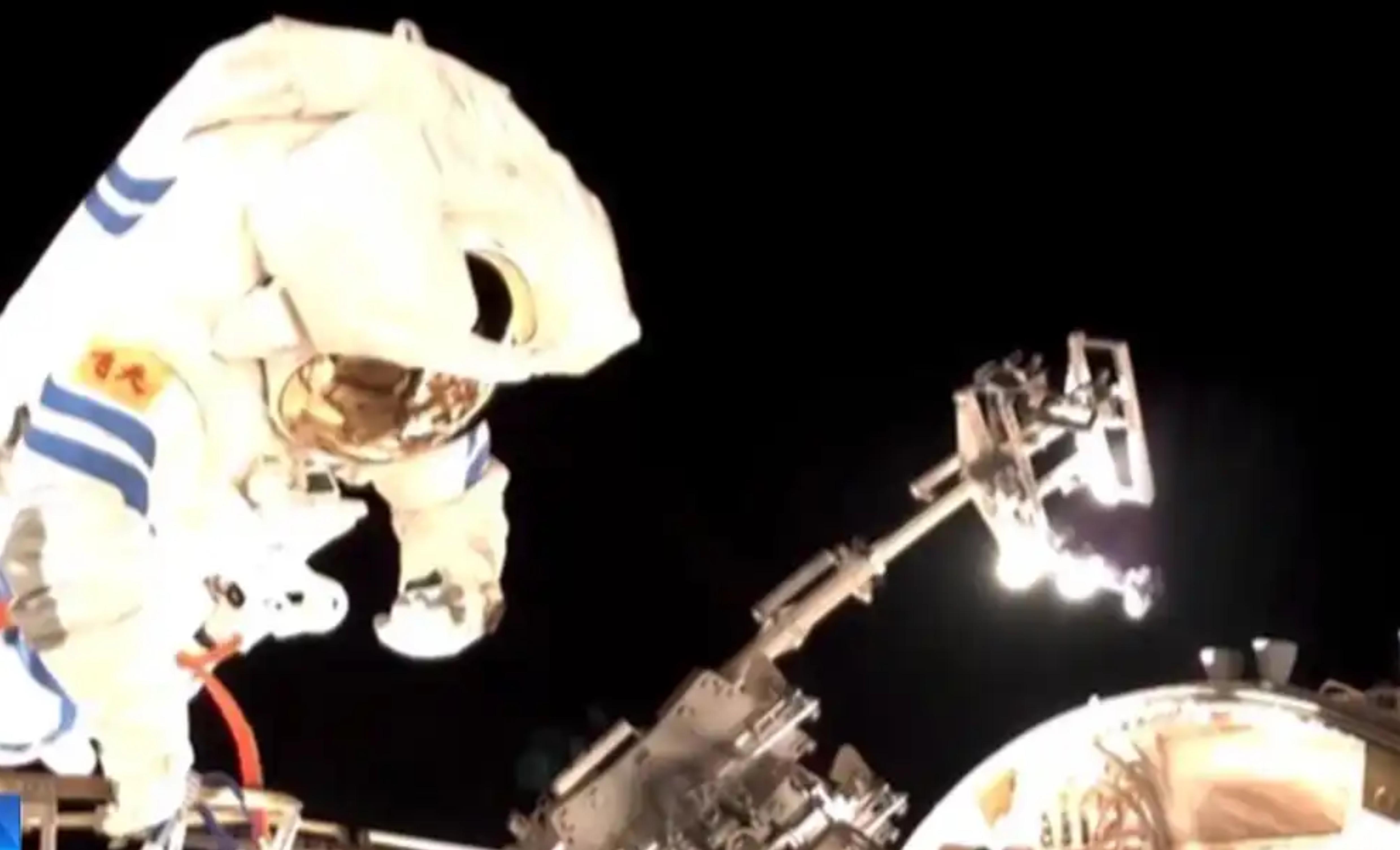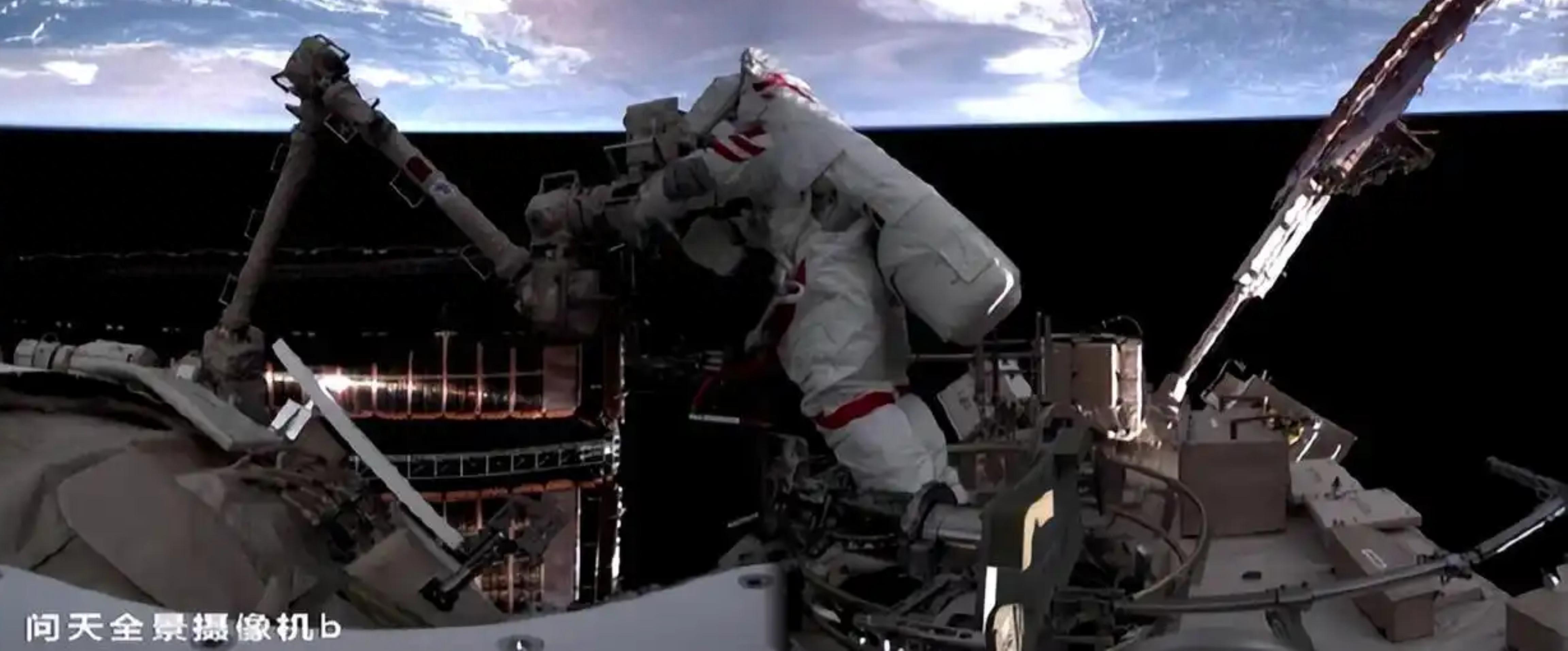 執行完“體檢任務”後,張陸於15時21分藉助機械臂抵達天和核心艙外部,隨即展開空間站空間碎片防護裝置的安裝工作。