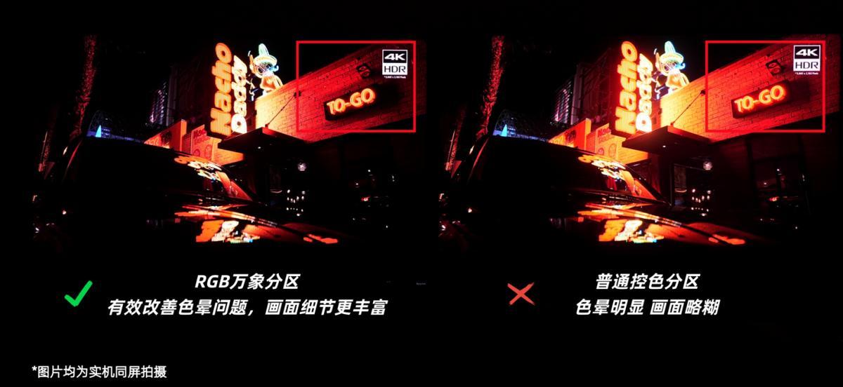 傳統RGB-MiniLED追求紅、綠、藍三色獨立芯片的極致參數,理論上色域更廣,但在實際應用中卻暴露短板。紅色芯片就像個嬌氣的“公主”,壽命短、衰減快。用久了,紅色會先掉隊,導致整體畫面偏色,比如“夕陽紅“直接變成“夕陽黃”,人臉膚色發青等。此外,三燈一組的發光源,如果控光處理不好,還會頻發串色、色暈等問題。