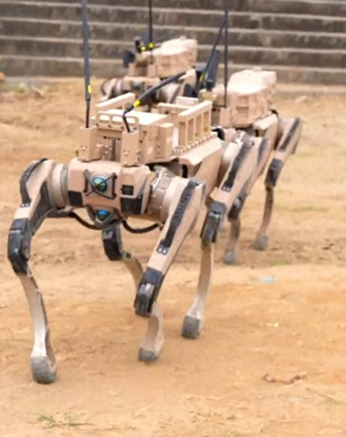 這回演練的視頻放出來的不是很多,機器狗的畫面更是少得可憐,就看到一隻機器狗開火。實際上,咱家的機器狗不僅可以單獨作戰,還能團隊協作,而且還有升級版的機器狼。