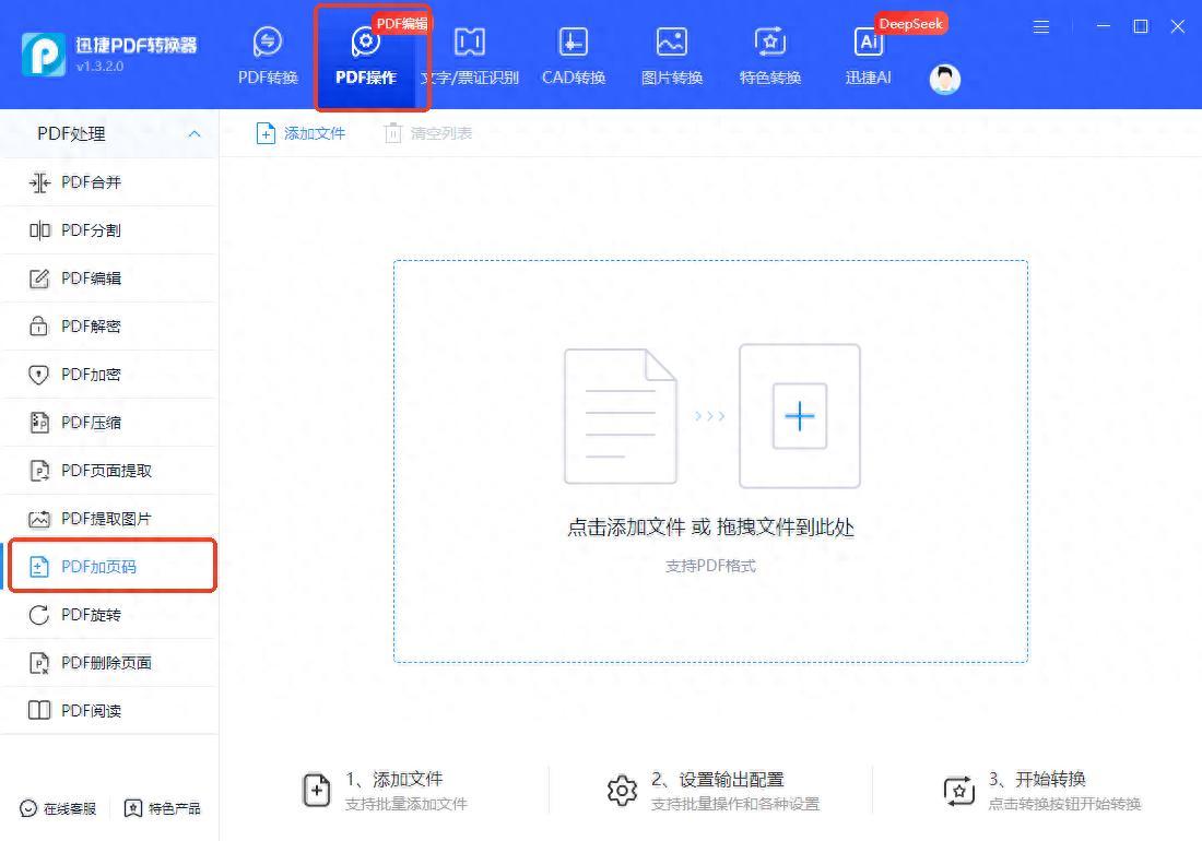 打開軟件,在首頁找到【PDF操作】,選擇【PDF加頁碼】,導入PDF文件。