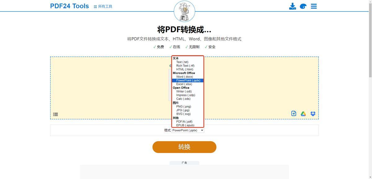 一個國外的在線PDF轉換網站,支持PDF轉換爲PPT、TXT、jpg等格式,操作簡單。只需要在首頁找到【PDF轉換】,選擇【將PDF轉換成】,導入PDF,設置導出格式爲PPT,最後點擊【轉換】即可。