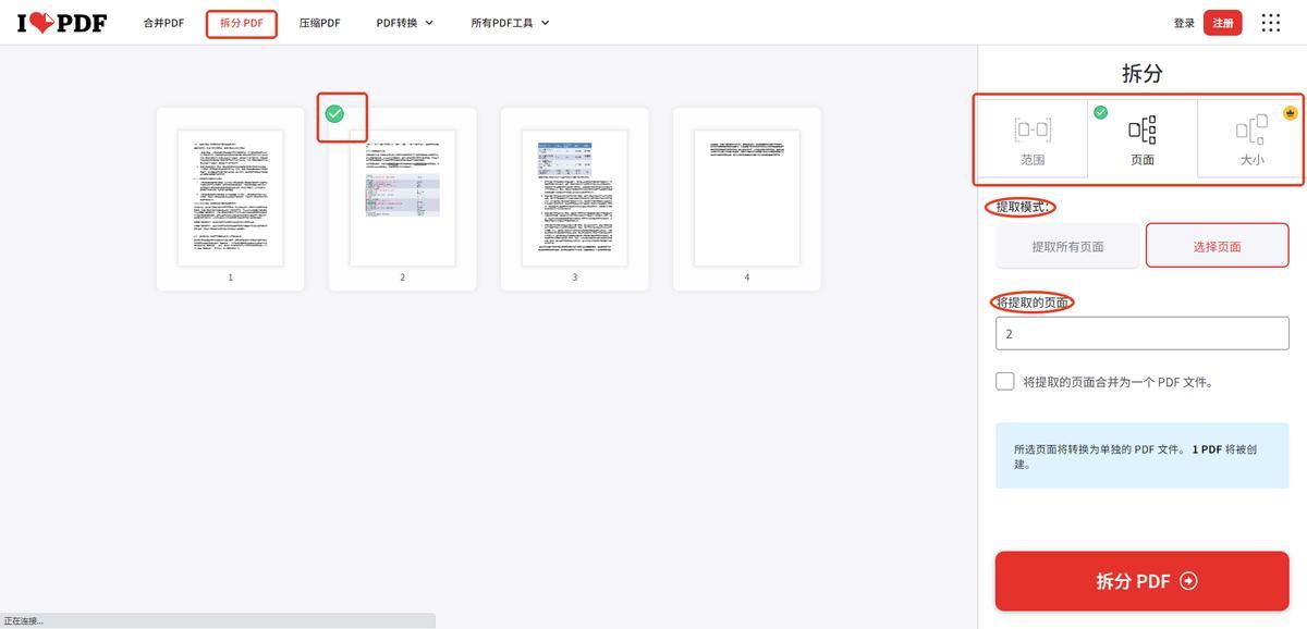 一個在線的PDF處理網站,界面是中文的,方便操作,它自帶的拆分PDF功能可以拆分出PDF文檔中的一個頁面,只需要選擇該功能,導入PDF文檔,選擇安裝“頁面”或者“範圍”,進入後簡單設置一下參數,選擇要提取的一頁,最後點擊【拆分PDF】即可。