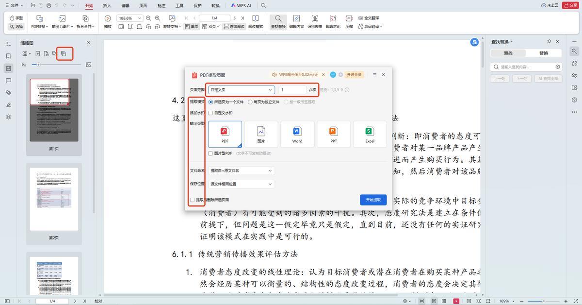 一個常見的辦公軟件,也能把PDF文檔的其中一頁提取出來,操作也不復雜,只需要點擊縮略圖下面的【提取頁面】按鈕,在PDF提取頁面中選擇頁面範圍爲自定義頁,然後設置爲需要的那一頁,再調整一下區域參數,最後點擊【開始提取】即可。