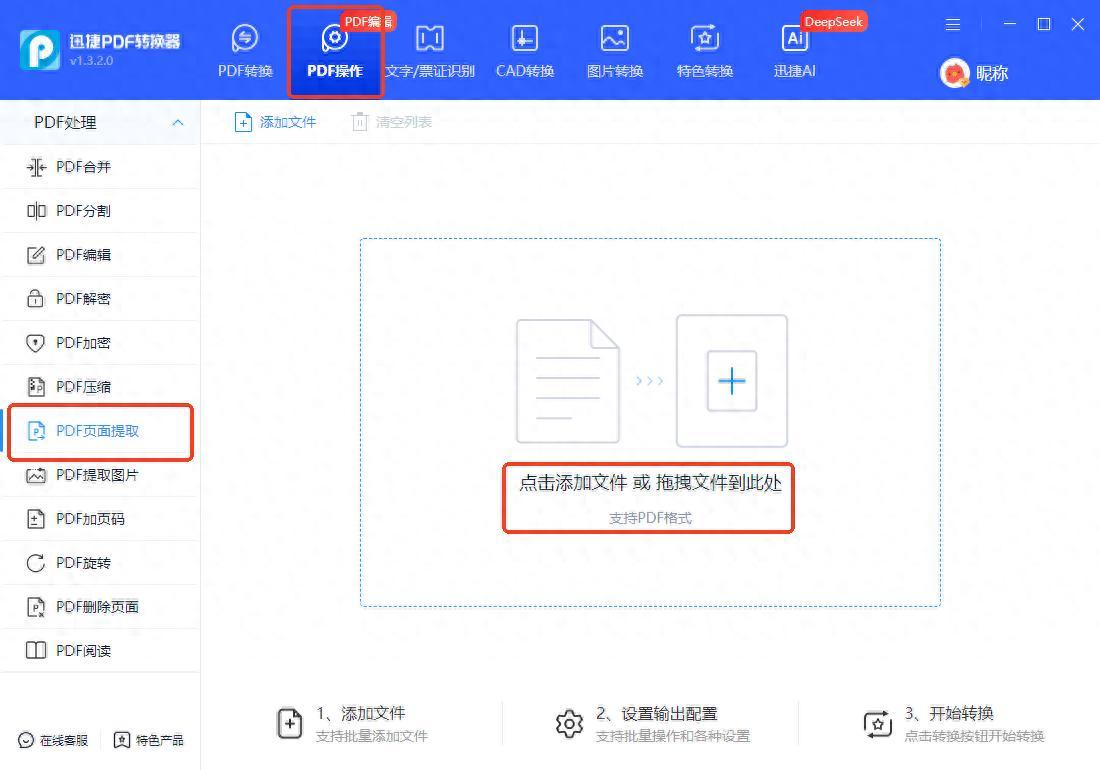 打開軟件,找到【PDF操作】中的【PDF頁面提取】,接着在右側界面點擊添加按鈕上傳PDF文件。