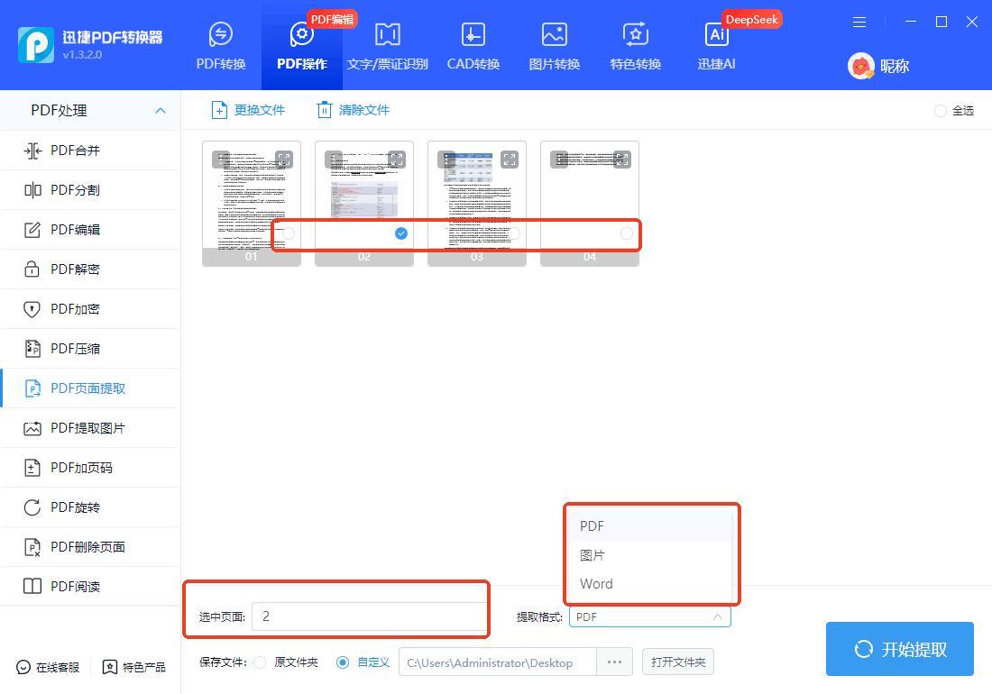 接着可以直接勾選要提取的那一頁,也可以在下方的【選中頁面】中直接輸入頁面數字,還能自定義設置輸出的文件格式爲PDF、圖片或Word。