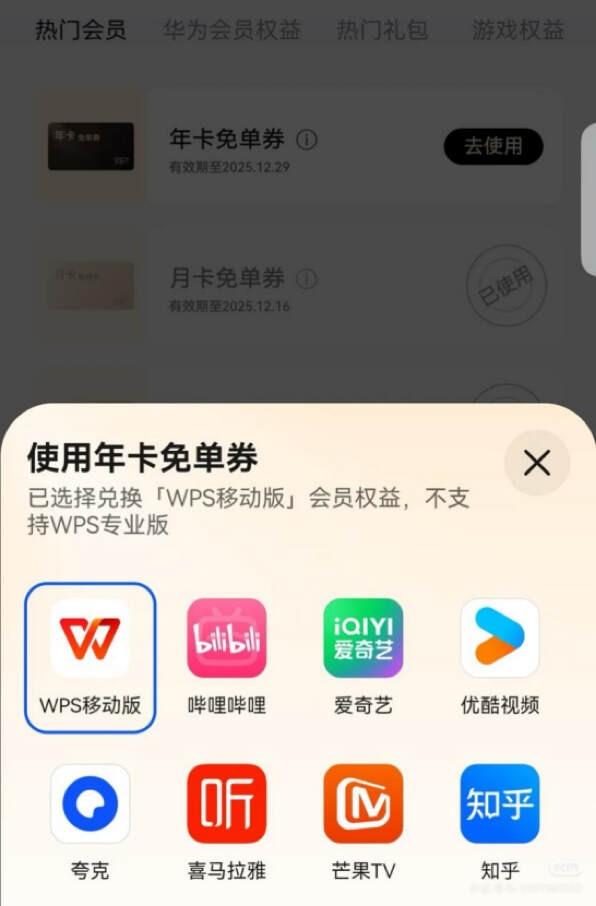 如果想要兌換熱門應用會員,首籤後的第30天可參與年卡免單券抽獎,抽中後可以兌換芒果TV、優酷視頻、愛奇藝、知乎、嗶哩嗶哩、喜馬拉雅等熱門應用會員八選一。
