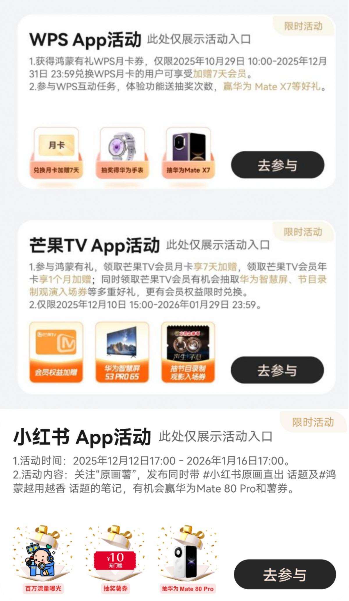 除此之外,還有WPS、小紅書、芒果TV限時活動,12月31日之前用領到的月卡免單券兌換WPS可以加贈7天會員,參與互動任務機會抽華爲Mate X7等好禮。兌換芒果TV會員月卡可以加贈7天會員,兌換芒果TV會員年卡可以加贈1個月會員。同時還有機會可以抽華爲智慧屏、節目錄制觀演入場券等。小紅書用戶關注“原畫薯”且帶上小紅書#原畫直出 和#鴻蒙越用越香 兩個話題發佈筆記,就可以參與華爲Mate80 Pro手機抽獎!