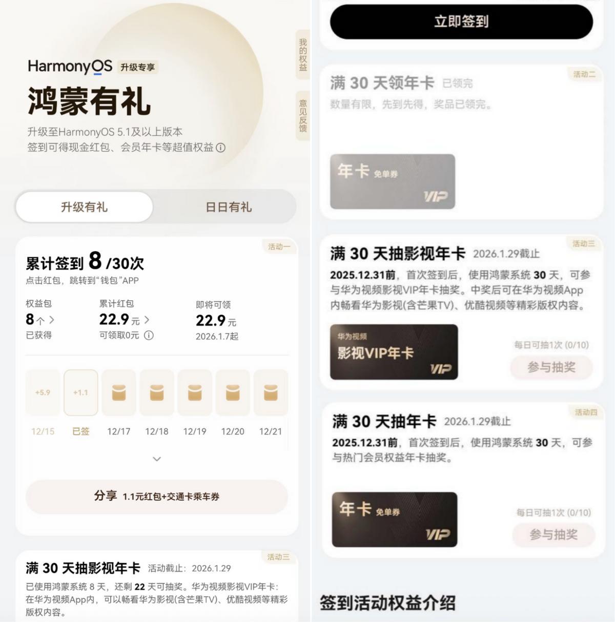 如果你升級了鴻蒙 6,但是還沒參與“鴻蒙有禮”活動的話,要趕緊行動起來了,我看首籤活動就截止到12月31日。參與活動的方式很簡單,桌面右滑進入負一屏,點“鴻蒙有禮”進入活動頁,每天點進去順手簽到,就能領取隨機現金紅包和各種權益,福利滿滿值得衝!