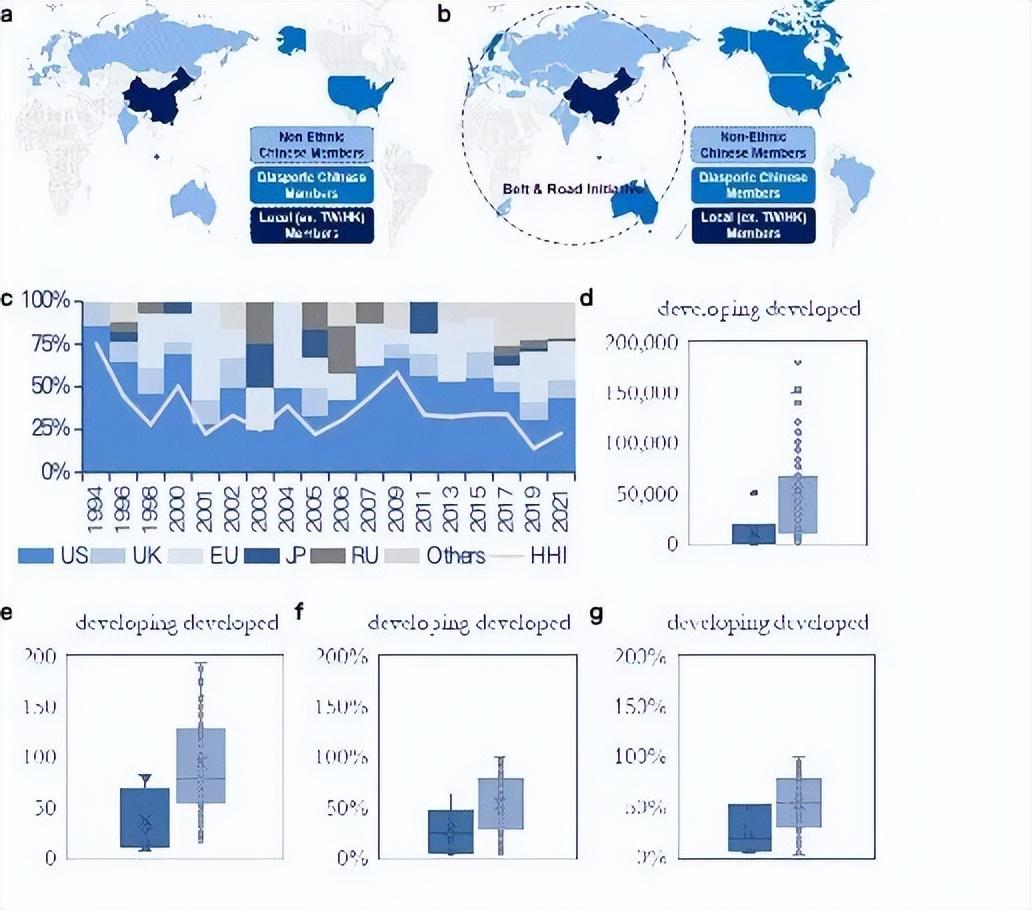 圖2:中國兩院外籍院士地理分佈。Fig. |Geographic Distributions of CAS & CAE Foreign Members. a. Network of foreign members elected before 2010 (HHI = 0.368). b. Networks of foreign members elected after 2010 (HHI = 0.229). c. HHI (Herfindahl–Hirschman Index) clustered by citizenship country. d–g. Average (d) citation, (e) H-index, (f) normalized citation, and (g) normalized H-index (field normalization by percentile ranks) of foreign members elected in the last five years (2018–2022) by citizenship region. Developing n = 8; Developed n = 83. Error bars are standard errors clustered by academics. P-value: tests are two-tailed. *** p < 0.01, ** p < 0.05, * p < 0.1.