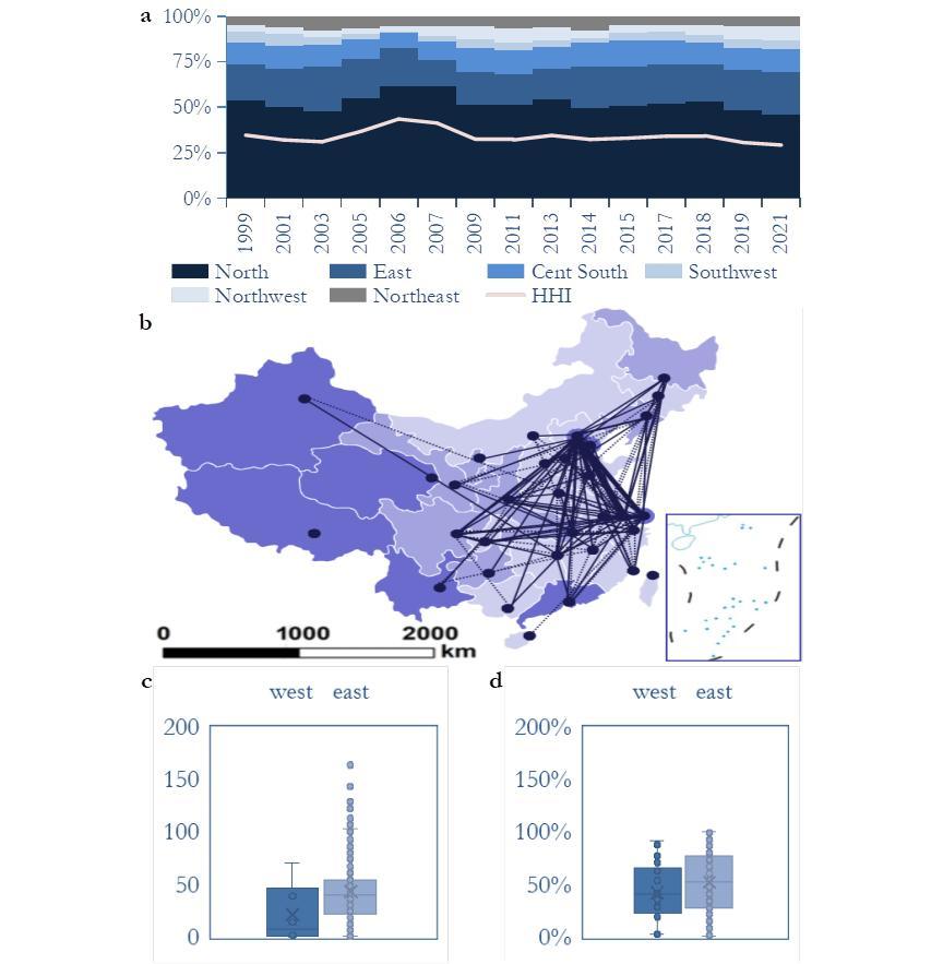 圖3:中國學術精英隸屬機構分佈。Fig. 3|Chinese Academies’ Regular Members by Places of Institutional Affiliations. a. 3-cohort average by affiliate location. HHI: Herfindahl–Hirschman Index. b. Birth–affiliation mobility, cumulated over 1999–2022. Provinces are coloured as affiliation contributors (deep; affiliation/birth ratio ≥ 1) and minor (< 1)/major (< 0.5) birth sources (light). Line weights exhibit the intensity of province-level mobility (only those > 1 are exhibited). c–d. Average (c) H-index and (d) normalized H-index (field normalization by percentile ranks; See Methods: Data Process) of members elected in the last five years (2018–2022) by affiliated location (divided by the Hu Huanyong Line). West China n = 31; East China n = 198. Error bars are standard errors clustered by academics. P-value: tests are two-tailed. *** p < 0.01, ** p < 0.05, * p < 0.1.