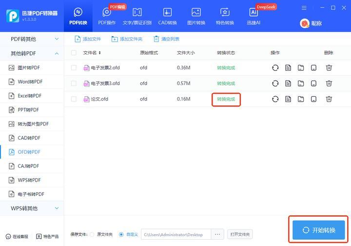 最後點擊右下角的【開始轉換】,即可得到將ofd轉換成功的PDF文檔了,在指定文件夾中就能找到了。