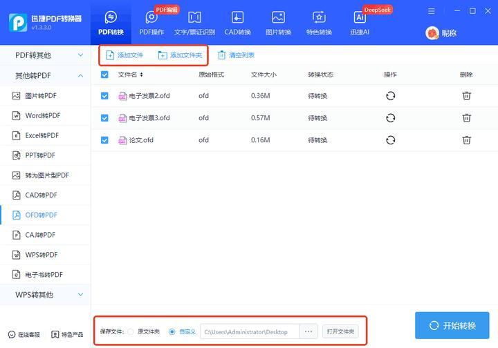 可以選擇【添加文件】導入需要轉換的ofd文件,也可以直接點擊【添加文件夾】導入整個文件夾的ofd文檔,接着設置一下輸出位置。