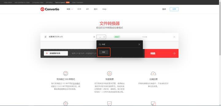 一款國外的在線轉換工具,支持文檔、圖片、視頻、音頻等多種格式的文件相互轉換,可以將ofd轉換成PDF格式。只需要通過首頁的導入按鈕上傳ofd文件,選擇輸出格式,最後點擊轉換按鈕即可。