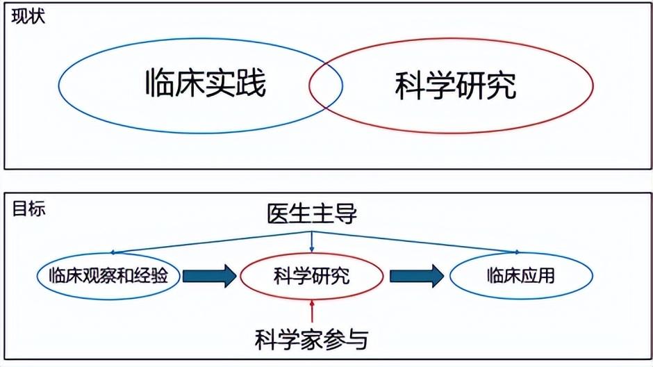 上述這些手段,特別是“買論文”,已經被各界反覆進行反思和批判。但總體而言,各個醫院都存在着醫生的科學研究和臨牀實踐互不相干(兩張皮)的問題(圖1,上)。問題自然而然浮現出來:我們到底要不要鼓勵醫生做研究?醫生們應該做什麼樣的研究?醫生們開展的研究,是爲了實現什麼樣的目標和價值?