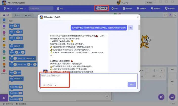 軟件內置了AI編程助手,它採用引導式教學,不會的問題可以發給它,它會一步步引導孩子自己找到問題,這種方法可以更好的學習知識。