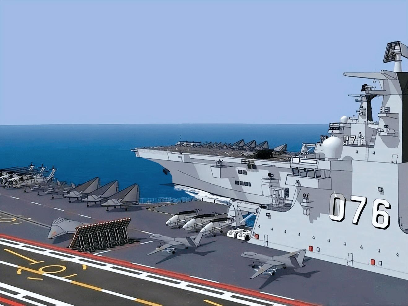 如075型那樣的兩棲攻擊艦一般,往往就會在腦海中勾畫出一幅幅甲板上排滿了直升機的壯觀的場景,直升機雖然靈活,但在現代防空火力面前,不管是航程還是突防能力都有些喫力,076的出現直接把這個天花板捅破了。