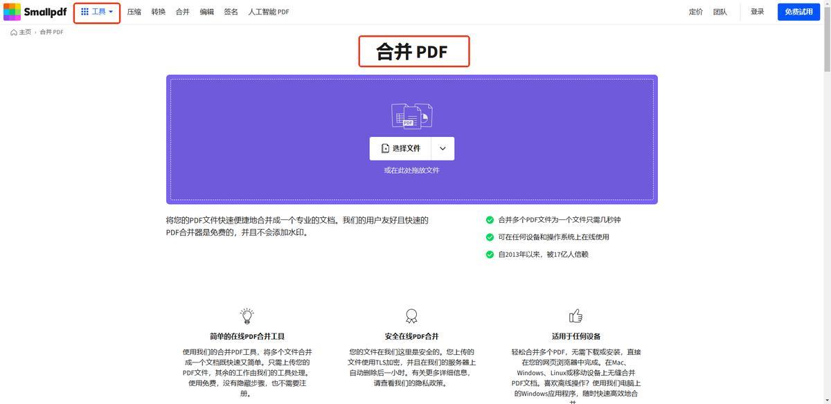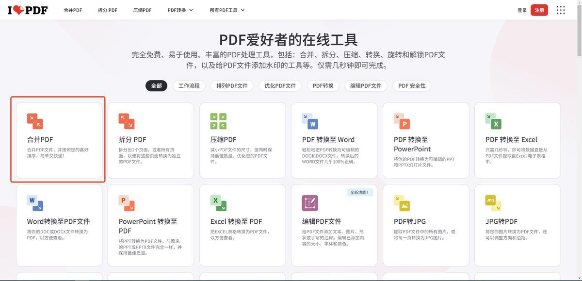 一個常用的在線PDF工具站,功能比較豐富,可以進行PDF合併操作,進入網站後,選擇合併PDF,導入PDF文件,設置一下參數即可快速合併,而且網站支持中文界面,操作指引比較清楚,新手也能使用。