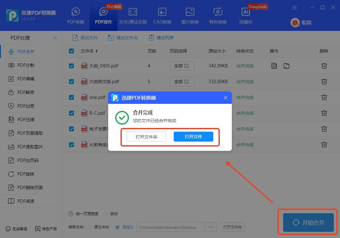 最後點擊右下角的【開始合併】,稍等一會就能得到合併成功的PDF文件了。